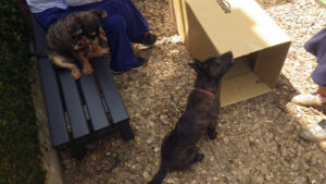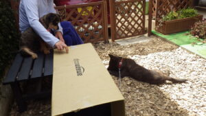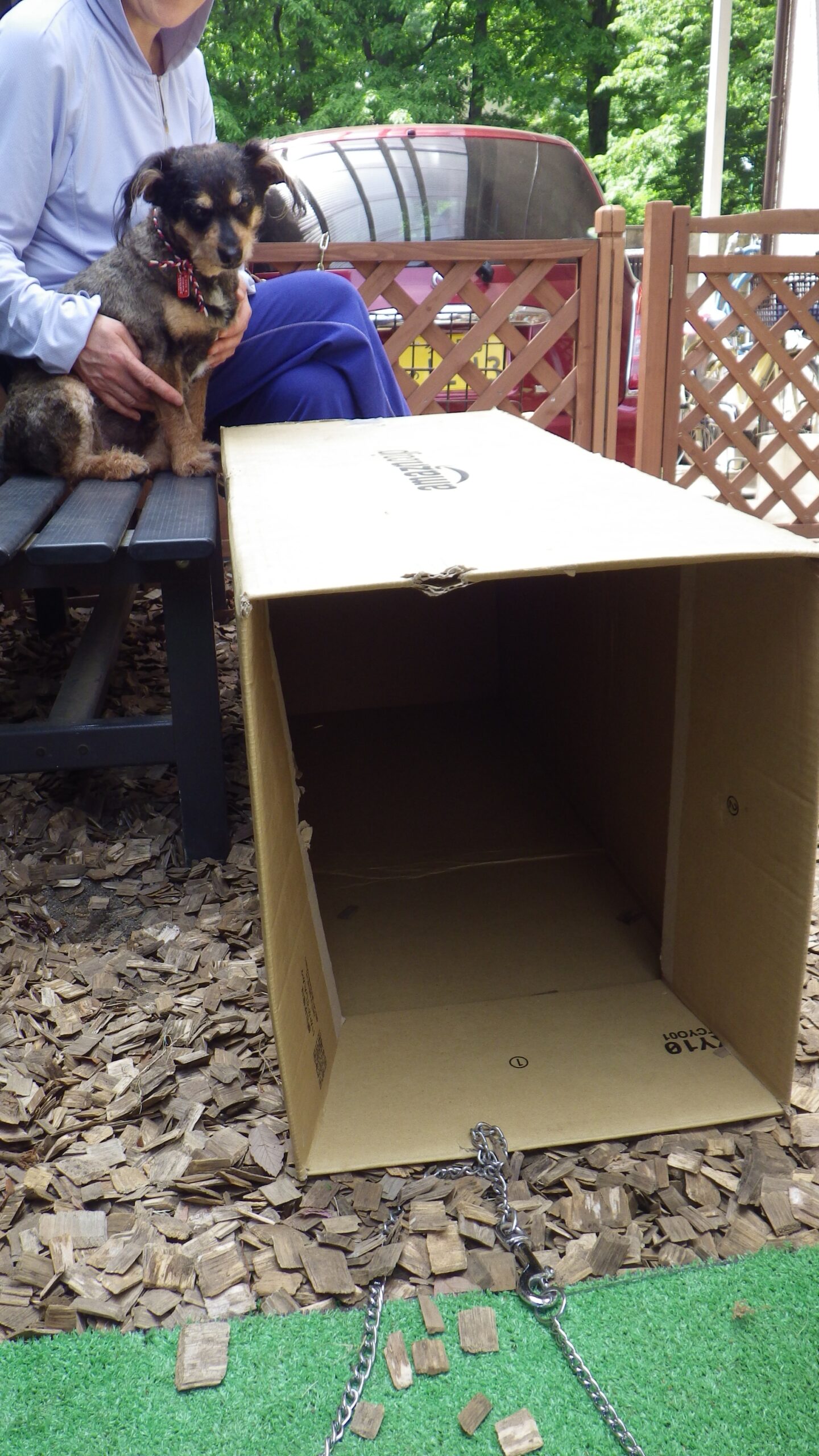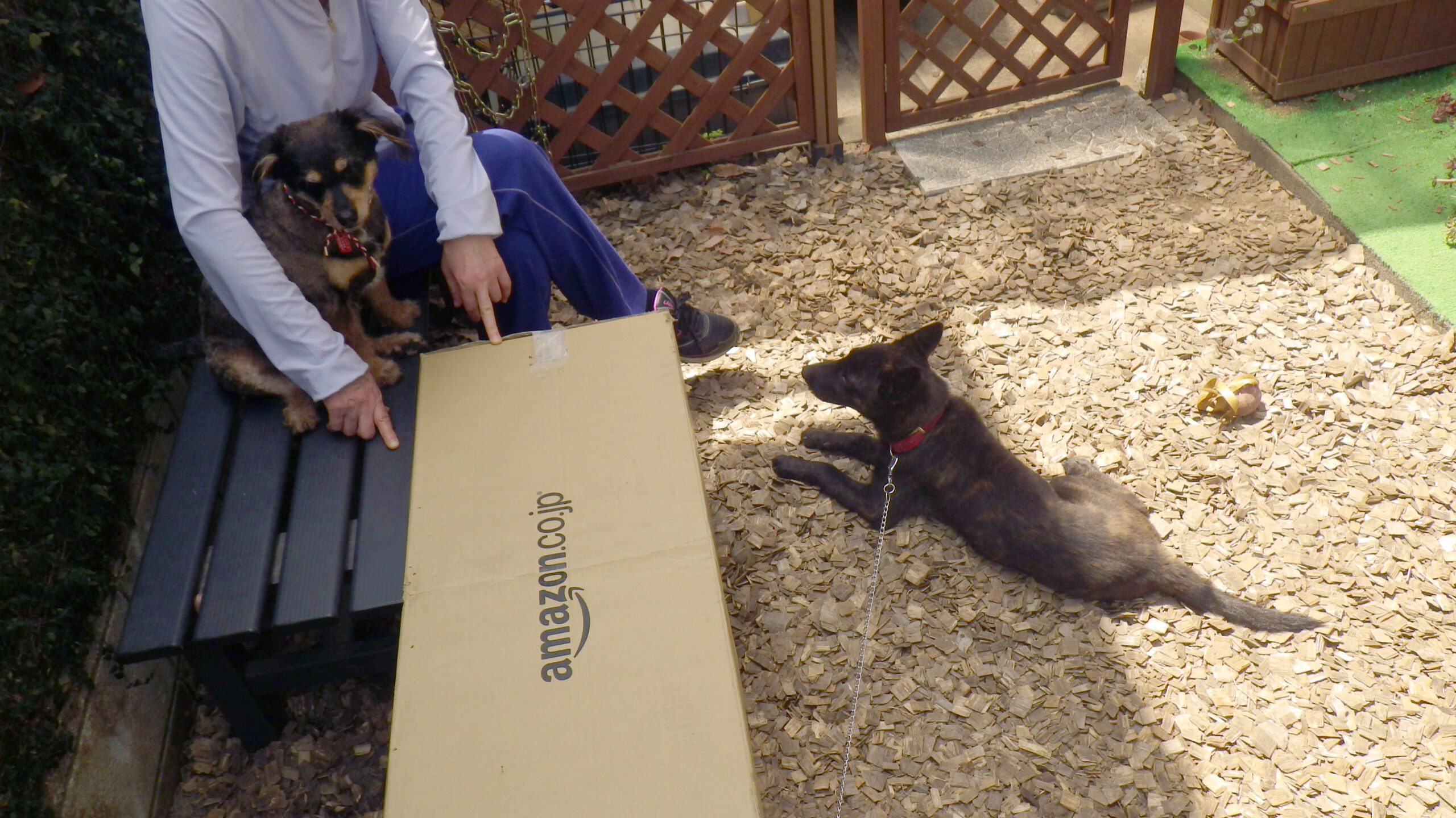 カイちゃん(仮)が近所のお子様に遊んでもらっている間、マロはずっとベンチから不機嫌そうに見学(^_^;)