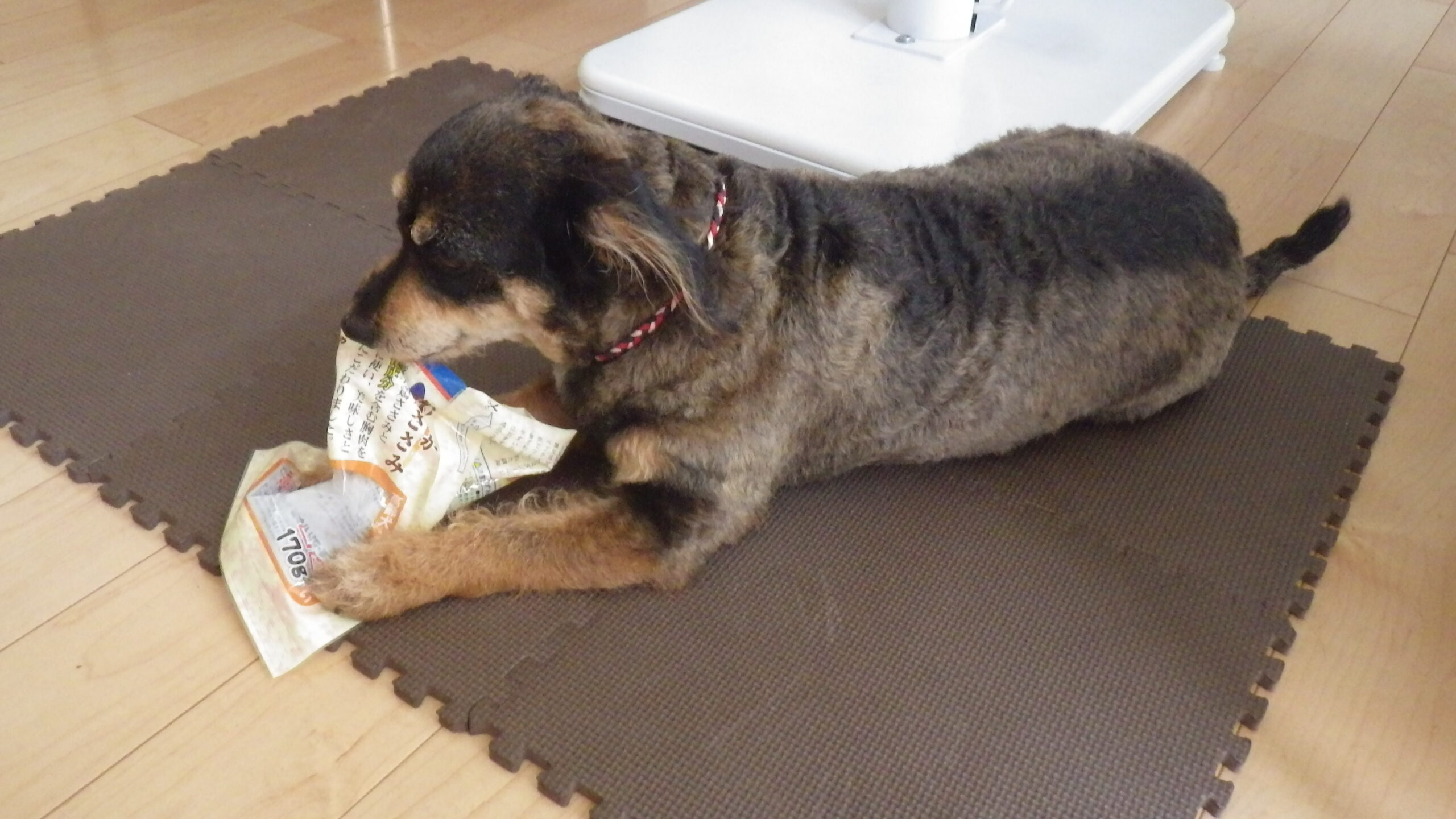 飽きて部屋に戻り、おやつが空になってもなお 袋をしゃぶり続けていました。